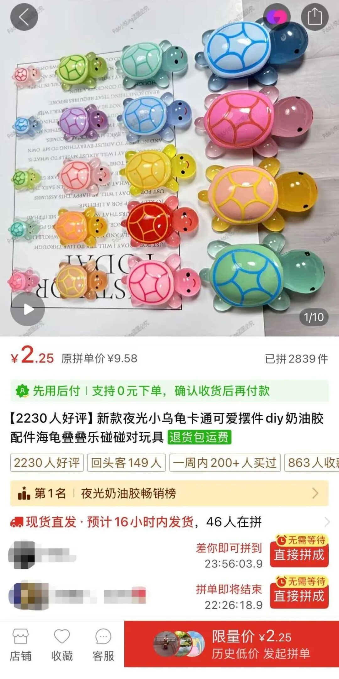 这这乌龟在拼多多上五毛一个,塑料质感、夜光漆味重、造型略丑,实在没什么具体用途。抽回家只能落灰,占地方。于是风口一过,乌龟们就被打包进收纳盒,和人类短暂的上头一同归于沉寂。
