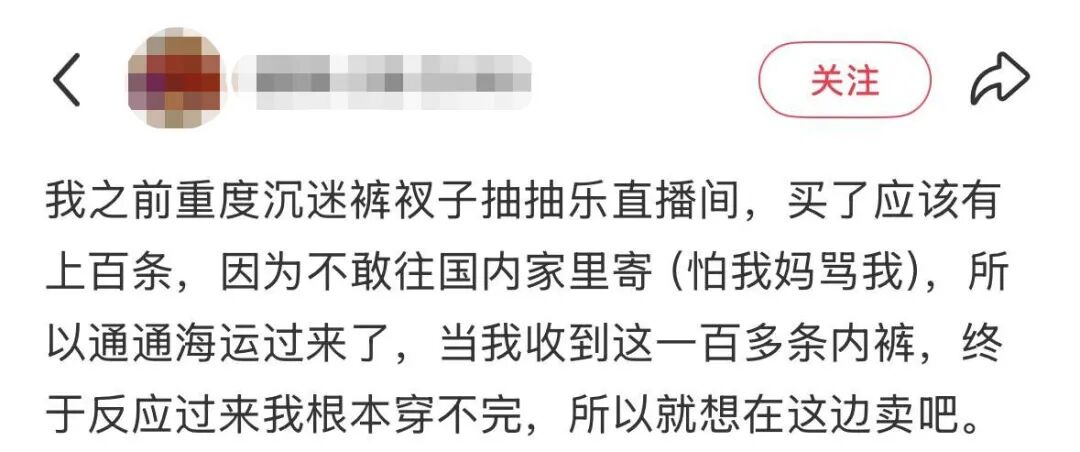 一位海外网友沉迷抽抽乐直播间,抽了上百条内裤,寄回家怕挨骂,于是一箱内裤从义乌出发,千里迢迢海运到美国。