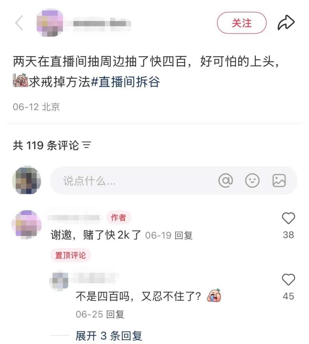 还有更离谱的。“戒社”里有人投稿,说自己沉迷于抽抽乐,花了十几万游走在各个苦茶子、袜子、小马宝莉卡等直播间,旅游回家发现有几百条内裤堆在家门口——那一刻天塌了。