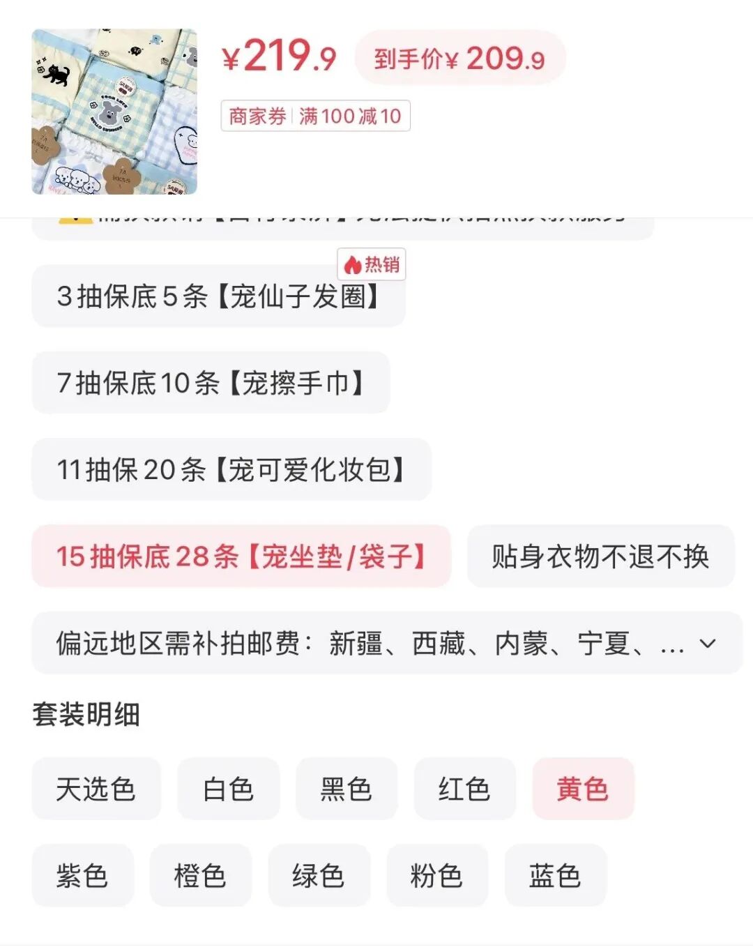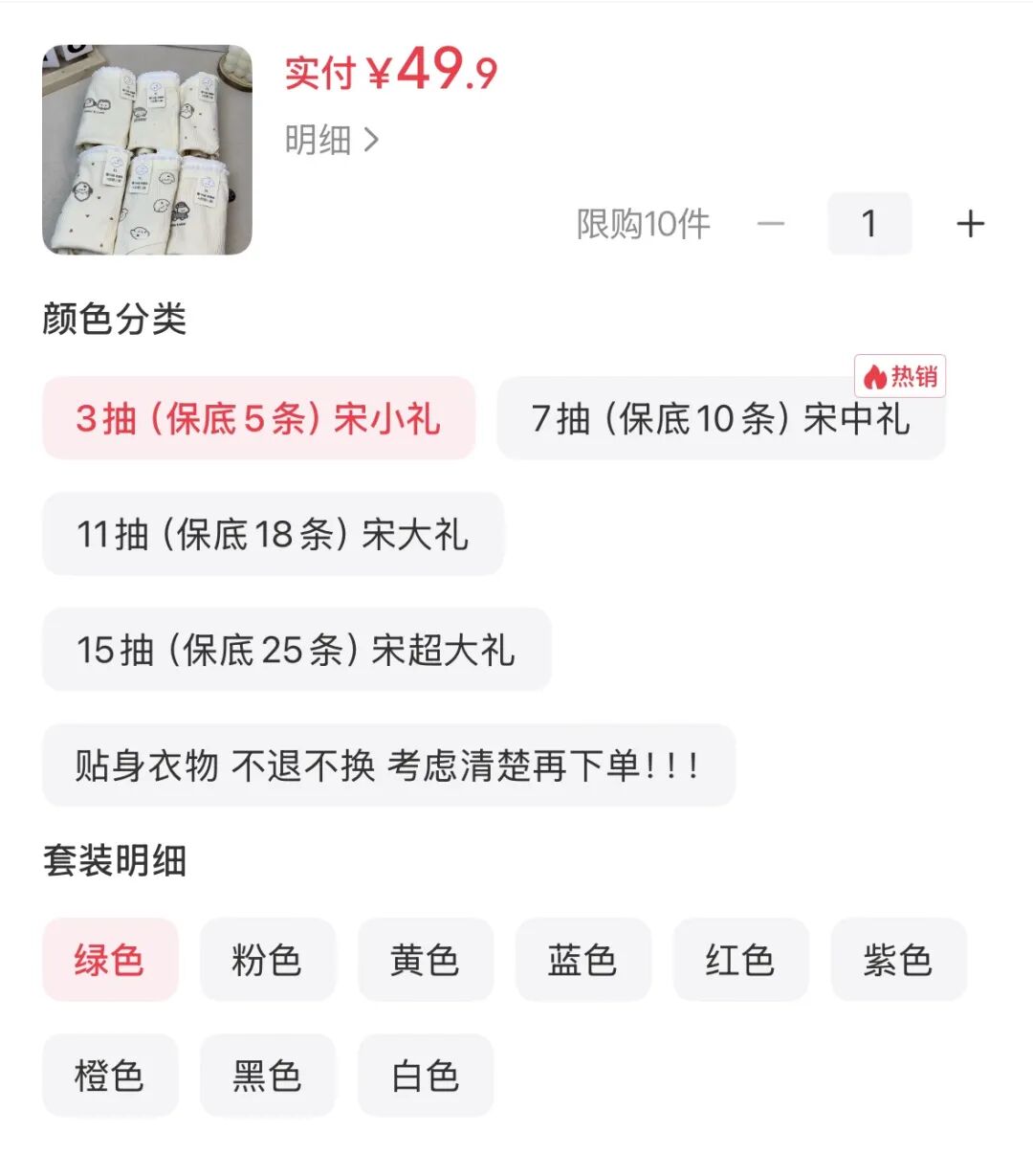 玩家下单购买一个套餐,比如3抽49.9元,7抽99元,拍的时候还要选择一个颜色。哦,这个可不是选你想要的内裤颜色,而是选你的幸运色。