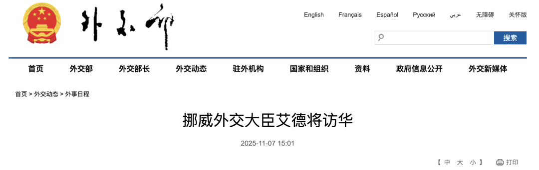 应中共中央政治局委员、外交部长王毅邀请,挪威外交大臣艾德于11月10日至11日对中国进行正式访问。