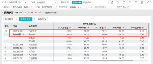 事实上,近年来西安旅游的偿债压力正明显上升。2022年、2023年、2024年,该公司资产负债率分别为68.16%、78.74%、89.58%。2025年前三季度,其资产负债率进一步上升至93.55%。值得注意的是,Wind数据显示,这一数值在A股旅游及景区行业上市公司中高居榜首,较行业平均值 41.80%高出超50个百分点。