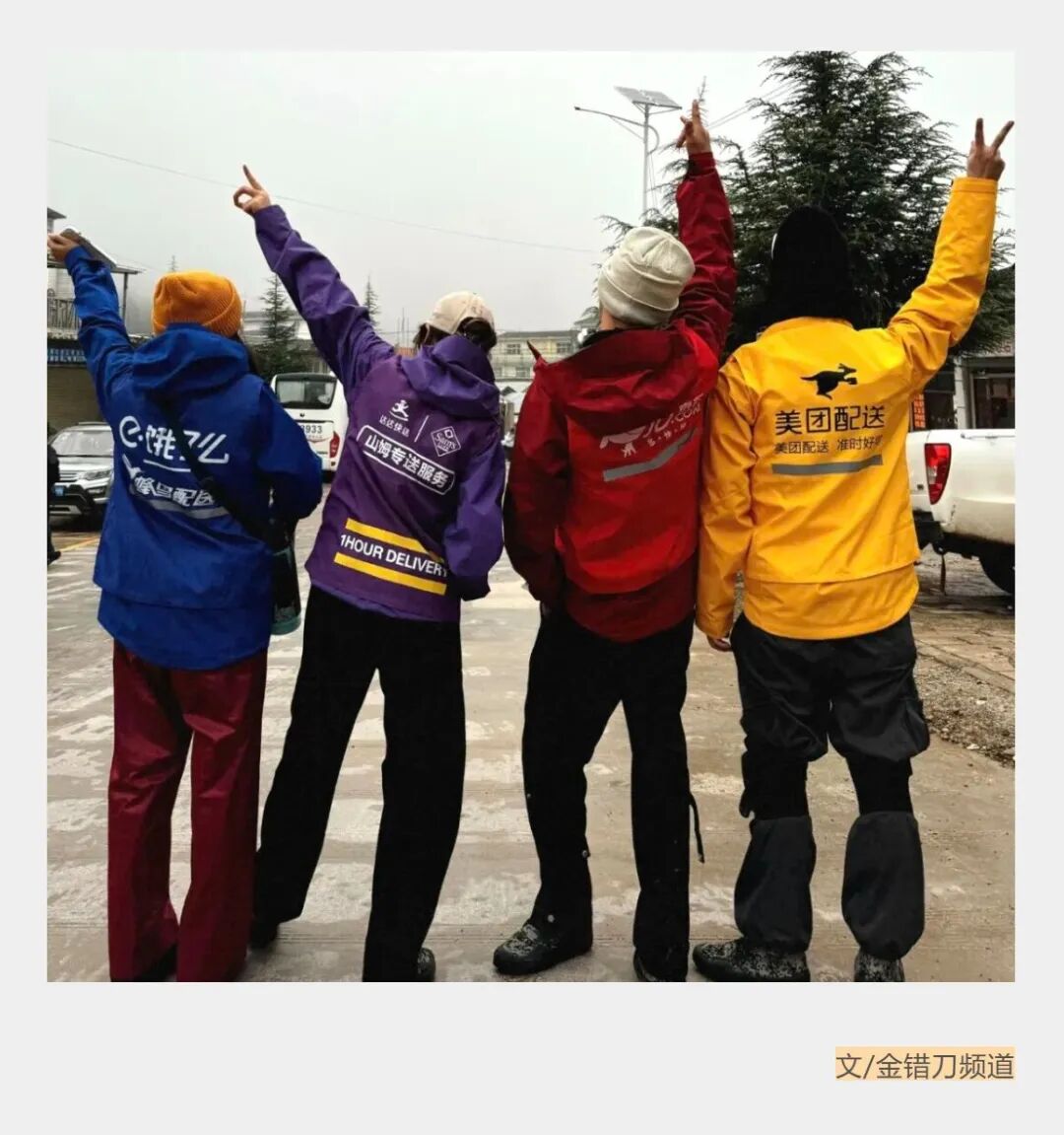 仅从颜色上看,各家外卖平台五花八门,美团黄、饿了么蓝、京东红争奇斗艳,江湖人称:已经没什么颜色留给冲锋衣品牌了。