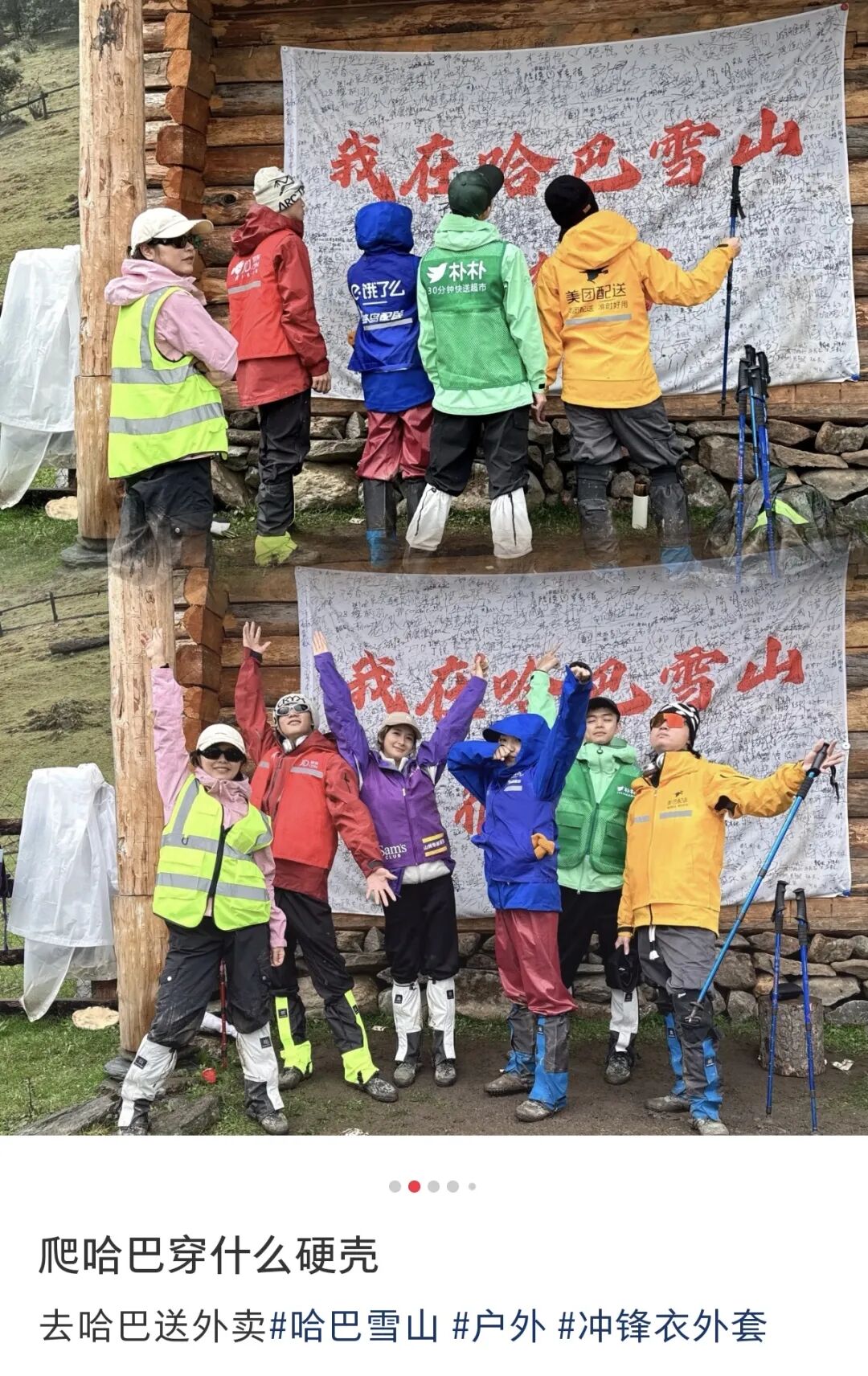 在社交平台上,户外运动还是滑雪运动的帖子中,用外卖工服平替冲锋衣和滑雪服的人越来越多。网红打卡点哈巴雪山上刷屏的,除了三大外卖平台工服的爱好者还有麦门信徒。