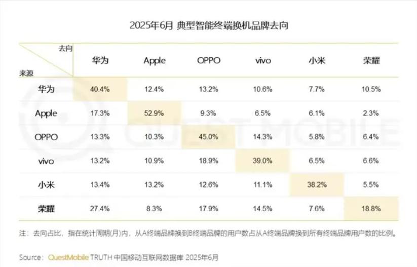 值得关注的是,根据此前QuestMobile公布的典型智能终端机品牌去向榜单来看,在反映用户忠诚度的同品牌换机比例这一指标上,荣耀的同品牌用户留存比例表现不佳,仅为18.8%,低于部分安卓同行水平。