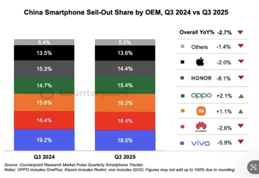 近日,市场调研机构Counterpoint发布2025年第三季度中国智能手机销量数据。数据显示,荣耀当季销量同比下降8.1%,在主流厂商中降幅最大,同时市场份额降至14.4%,在国内市场排名第五。