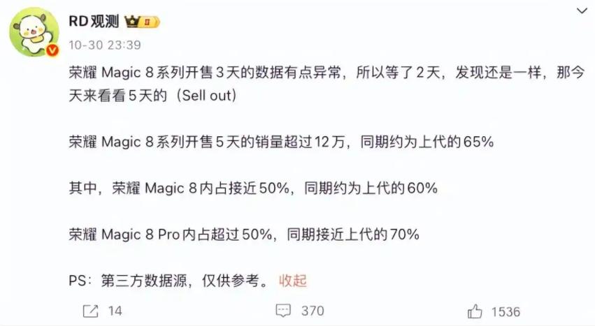 根据近期数码博主“RD观测”披露的数据显示,荣耀Magic 8系列开售5天,销量超12万台,仅为上代同期的65%。其中Magic 8占比约50%,约为上代同期的60%;Magic 8 Pro占比超50%,约为上代同期的70%。这也侧面反映出其高端机型的市场接受度有限。有行业分析师指出,荣耀高端机型在影像算法、系统生态等核心领域缺乏独家技术,品牌溢价能力难以与华为、苹果抗衡。