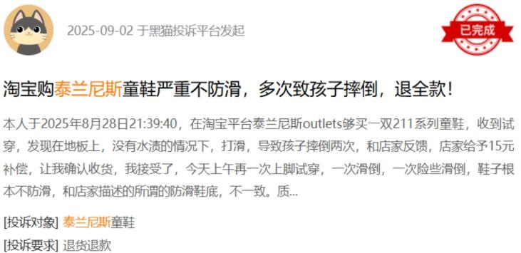 如同曾经红遍大江南北的“背背佳”,泰兰尼斯“少摔跤,走得稳”的产品标语先是精准击中了部分家长的育儿痛点,随后“稳稳鞋”加宽鞋底、防滑设计、根据年龄走姿分区支撑受力等设计又为其提供了具象化的解决方案。与此同时,品牌邀请奥运冠军许昕代言、产品绑定高端场景的密集营销战术,也让它进一步夯实了中产群体对自身的信任感,为后来的成交额高涨埋下了种子。有人曾这样形容“高端化”战术——真正的高端不是单纯的高价,而是要让消费者觉得“贵有贵的道理”。回望泰兰尼斯从0到1的全过程,我们不难发现它先用具体的产品,精准唤醒了目标用户的育儿焦虑,并为其提供了可行的解决方案。在这之后,泰兰尼斯又通过材质升级、技术升级、营销力度升级的组合拳,巩固了消费者对自己的“高端产品认知”。进而借助学步、体测、走姿维护等细分场景,实现了“放细线钓大鱼”的商业进阶。品牌主线任务即将生变事到如今,坐拥亿级商业帝国的泰兰尼斯当真无懈可击吗?答案自然是否定的。已知泰兰尼斯的高溢价和它在细分场景的高性能绑定,那么能左右品牌后续发展动向的,也势必是鞋子的穿着体验。经由关键词搜索,我们发现除黑猫投诉上有消费者表示鞋子不防滑以外,相关媒体报道也指出2025年10月,曾有消费者表示该品牌产品闷汗、部件设计不合理;2023年、2024年,该品牌曾因为勾心纵向刚度、可拆卸小附件而被市监部门重点关注。