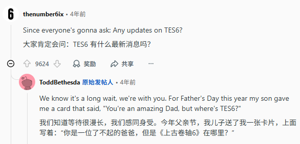 在四年前,为了庆祝《上古卷轴5》十周年,Todd在红迪上开了个答网友问的贴子,知无不言,但唯独对《上古卷轴6》的消息幽了一默