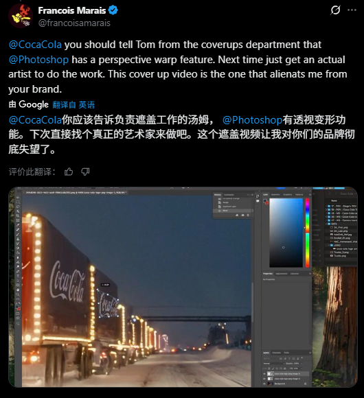花絮中另一些细节更是放大了这份怀疑,在几个使用PS修改的片段中,右下角的图层界面十分干净。而在粘贴“可口可乐”商标到卡车上的画面上,工作人员仍在使用最基本的“变形”功能,而非PS中成熟好用的“透视变形”。一些人猜测Secret Level公司内部或许并没有专业美术人员,因此他们放出的工作流素材也难以站得住脚。