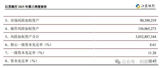 资本充足率是衡量银行抗风险能力的核心指标,江苏银行三季报显示,截至9月末,该行核心一级资本充足率为8.61%,一级资本充足率为11.28%,资本充足率为12.47%。从监管要求看,这些指标均满足当前城商行的监管标准,但相较于资产规模的扩张速度,资本充足率的提升显得乏力。