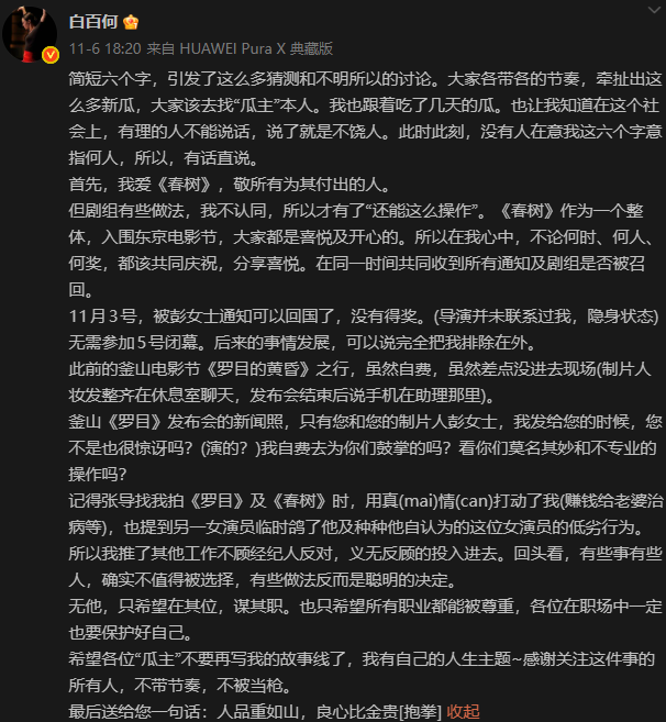 最后,来自白百何本人的澄清,她发微博重新聚焦火力明确控诉《春树》的制片、导演,矛盾是剧组内部矛盾,非奖项问题。