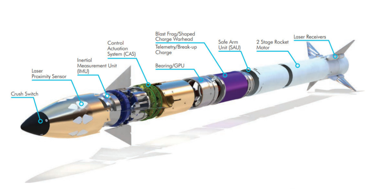 在制导方面,“欧洲燕”可以配置不同的制导系统,包括半主动激光制导、激光束制导、INS惯性制导+GPS+末端红外制导等,根据不同的战场需求做出相应的调整,以便实现效应最大化。以使用半主动激光驾束制导为例,在发射前直升机上的观察员使用稳定的EO摄像机和自动目标跟踪器(ATT)将激光指示器锁定到目标上,激光指示器发射带有编码的低功率光束,发射后安装在导弹尾部的两个接收器将探测激光能量并保持锁定,直至击中目标。