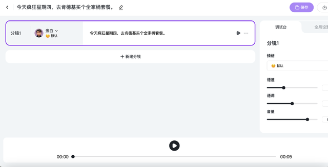 《读佳》体验发现,该工具在基础层面上支持文字一键转音频,用户输入任意文本(如 “今天疯狂星期四,去肯德基买个全家桶套餐”),选择单人音色即可生成自然旁白。