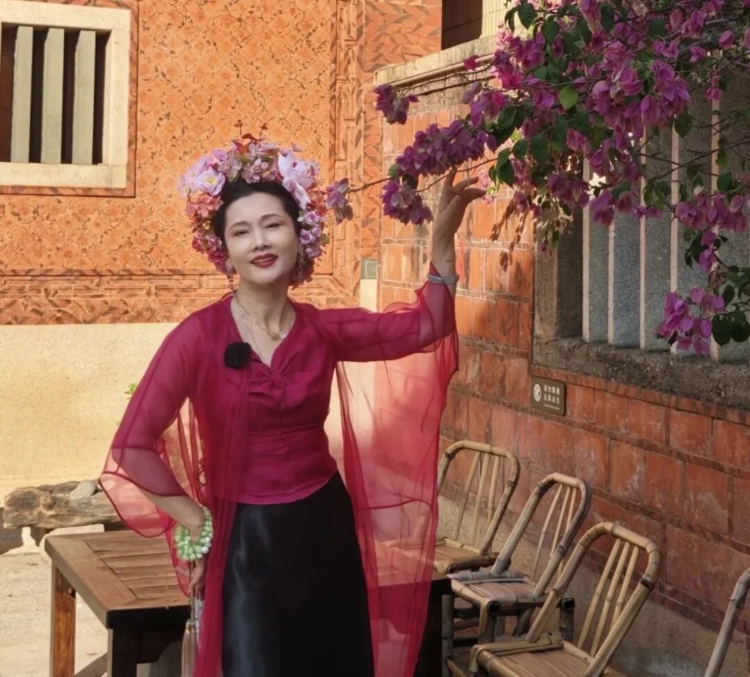 得益于长年的戏曲训练,她的身段几十年如一日地窈窕,身着旗袍,脚踩高跟鞋,一头大波浪长发,嗓音也依然清甜宛转。