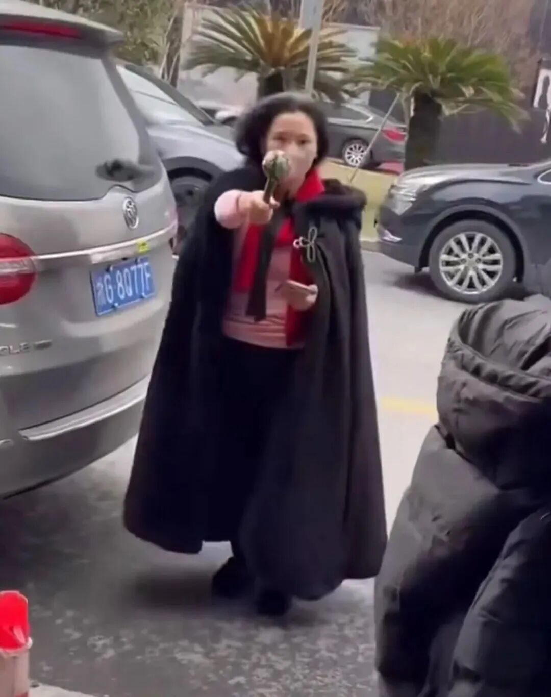 去年3月,何赛飞身着披风,手持艾草锤直指代拍,怒气冲冲地喊道:“手机给我,谁叫你拍的”。