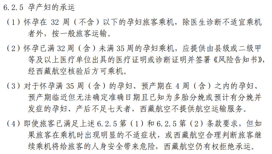 所以每家航空公司对于孕妇乘机都有自己的规章制度。就以西藏航空为例,其《运输总条件》第6.2.5条明确写着: