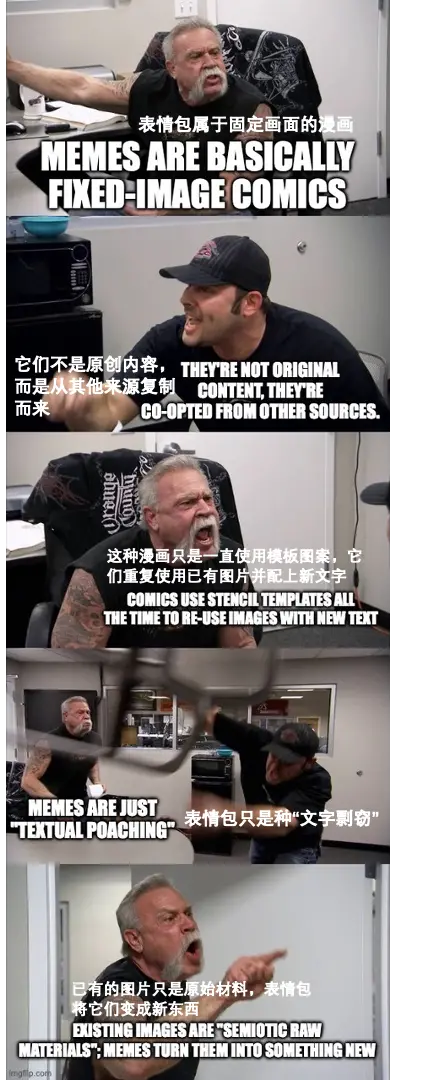 诚然,漫画家通常会同时创作图像和文字,表情包则将已有的视觉效果与新的文字结合。有些人可能认为这是抄袭,但阿巴特指出,像查尔斯·舒尔茨这样的漫画家长期以来一直使用模板(一种静态预制元素)来复制图像,这种做法也常见于其他漫画作品。表情包的幽默依赖于人们将图像与其出处联系起来,而不是模糊化。她将这种做法比作音乐中的采样,其最终的作品仍然是一件原创的艺术作品。