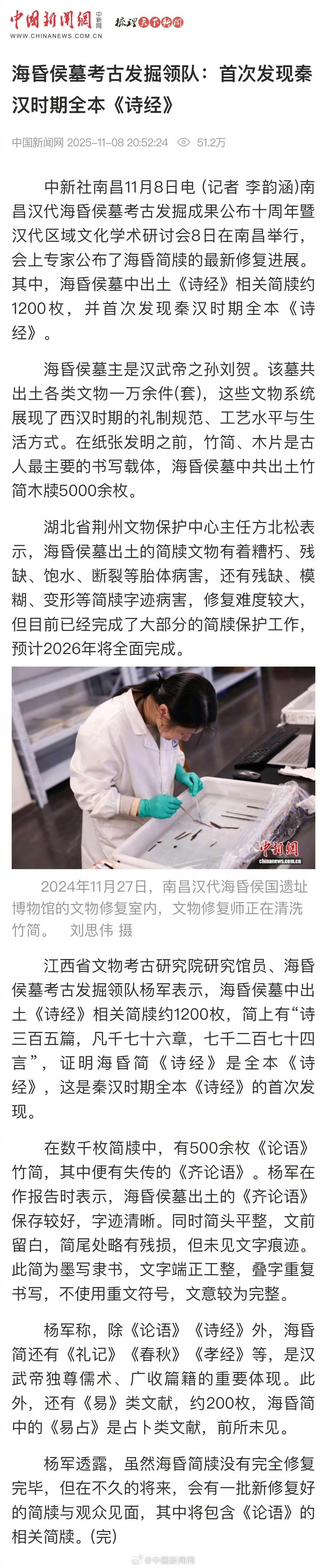 11月8日,新闻报道海昏侯墓简牍修复,“首次发现秦汉时期全本《诗经》”。