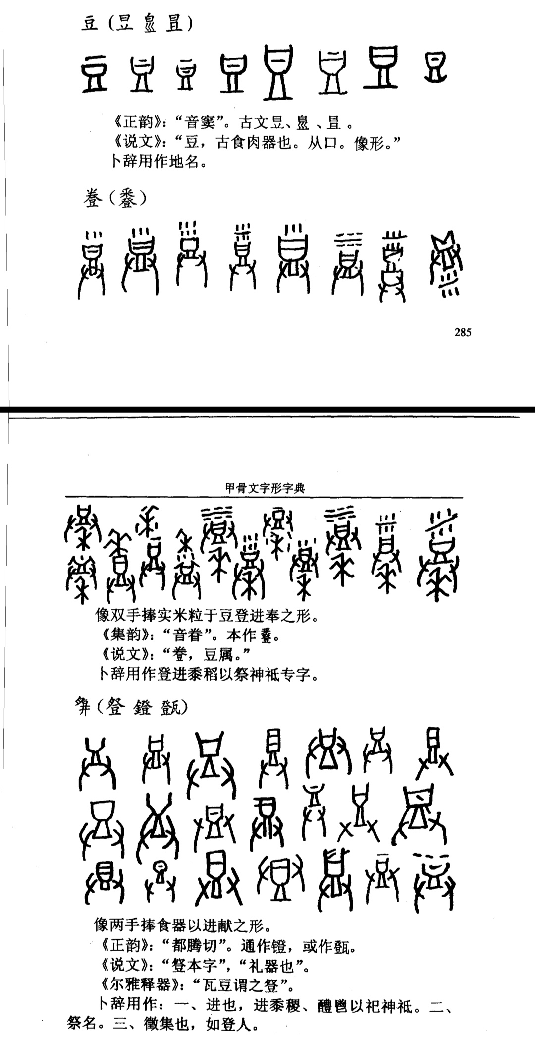 《說文解字注》豆,古食肉器也。……下一象丌也。祭統注曰:鐙豆下跗。是也。丷象骹也。祭統曰:夫人薦豆執校。校者,骹之假借字。注云:豆中央直者。