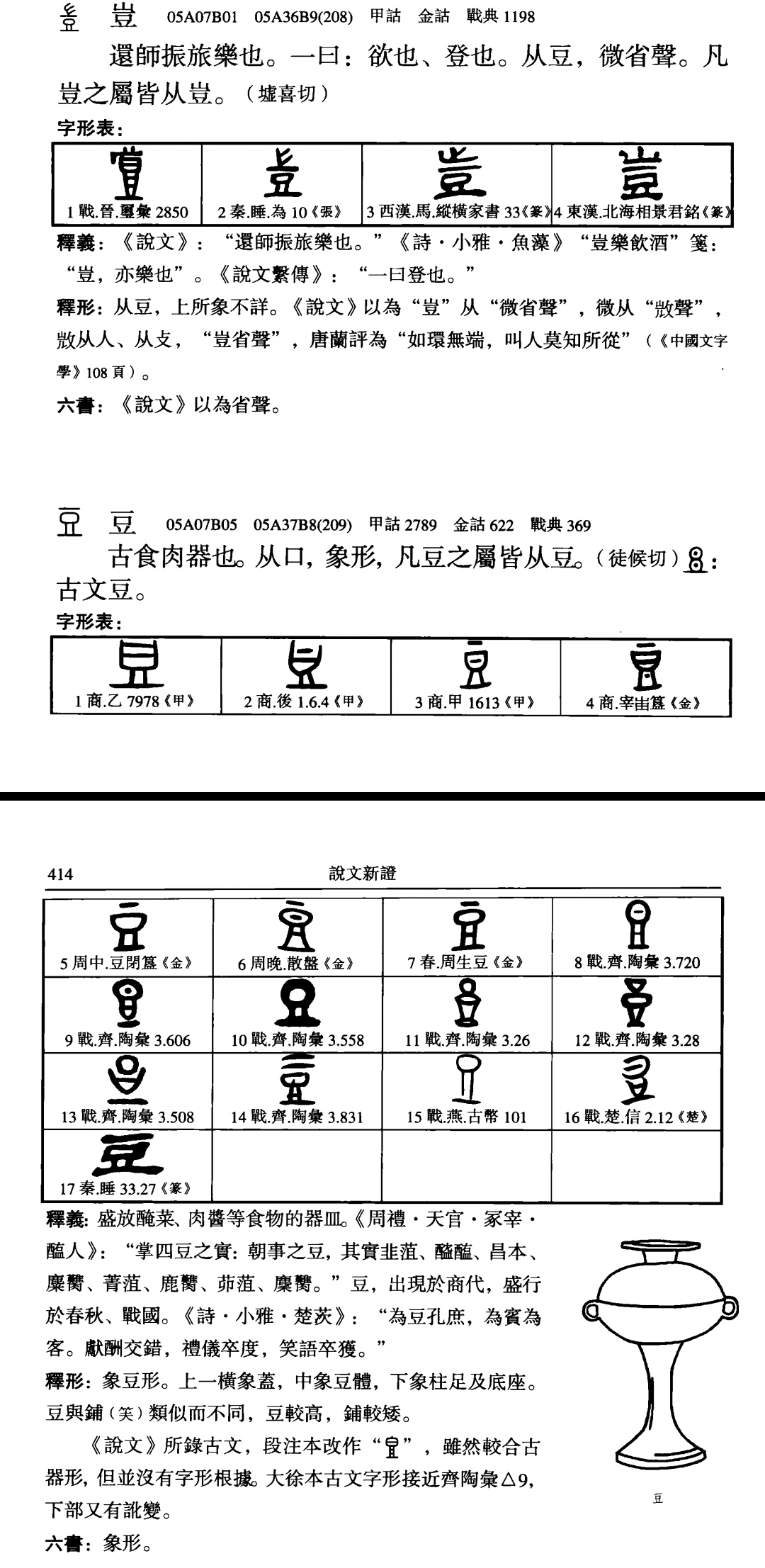 《說文解字注》豆,古食肉器也。周禮醢人:掌四豆之食。从口,音圍。象器之容也。象形。上一象幎也。特牲:籩巾以綌纁裏。……士昏:醯醢醬二豆,菹醢四豆,兼巾之。士喪:籩豆用布巾。祭統曰:夫人薦豆執校(骹、脚)。注云:豆中央直者。考工記曰:豆中縣。注:縣繩正豆之柄。