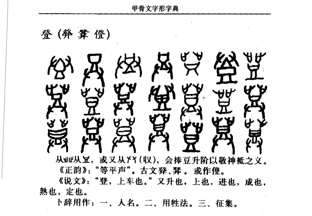 甲骨文【登(双手奉豆,上有双脚蹬踩)】用作人名。词例:命登眔彘工卫有禽。登获。