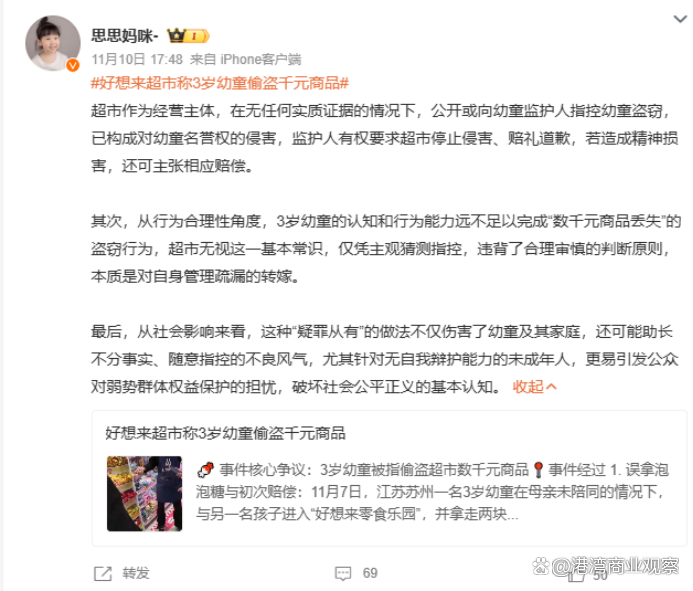 微博一位认证的网友思思妈咪认为,“超市作为经营主体,在无任何实质证据的情况下,公开或向幼童监护人指控幼童盗窃,已构成对幼童名誉权的侵害,监护人有权要求超市停止侵害、赔礼道歉,若造成精神损害,还可主张相应赔偿。其次,从行为合理性角度,3岁幼童的认知和行为能力远不足以完成‘数千元商品丢失’的盗窃行为,超市无视这一基本常识,仅凭主观猜测指控,违背了合理审慎的判断原则,本质是对自身管理疏漏的转嫁。最后,从社会影响来看,这种‘疑罪从有’的做法不仅伤害了幼童及其家庭,还可能助长不分事实、随意指控的不良风气,尤其针对无自我辩护能力的未成年人,更易引发公众对弱势群体权益保护的担忧,破坏社会公平正义的基本认知。”