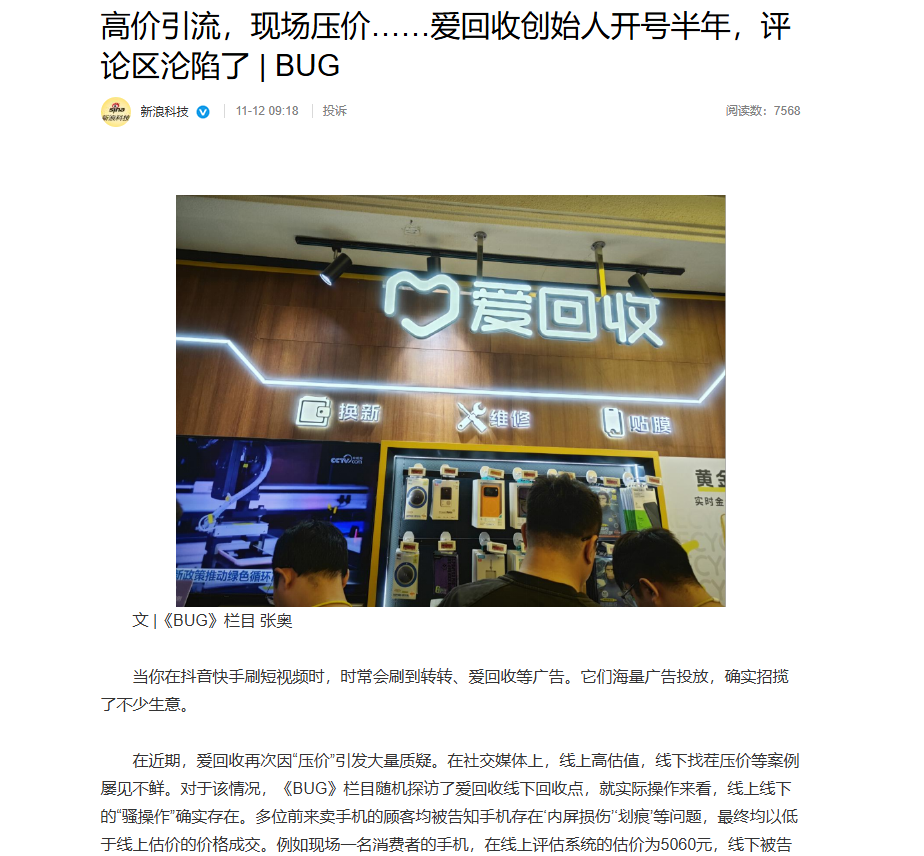 爱回收被曝验机存在“恶意压价”,线上高价引流,线下“检测”砍价_风闻