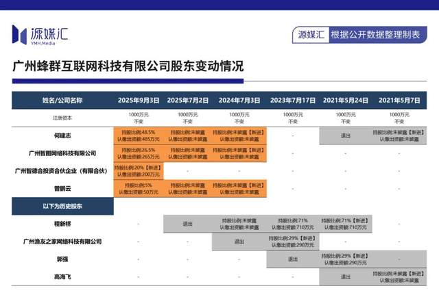 至此,广州蜂群现有股东中,何建志、广州智图、广州智德合、曾鹏云对应持股比例分别为48.5%、26.5%、20%、5%。