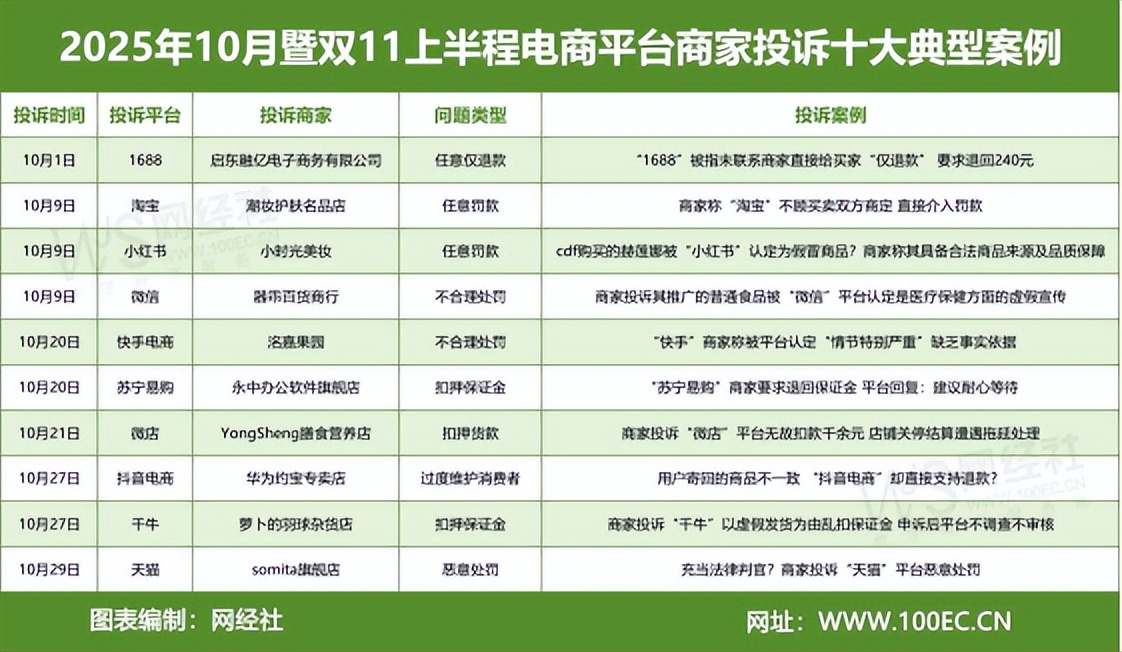 11月6日,依据网络消费纠纷调解平台“电诉宝”商家投诉通道10月受理的全国电商平台大量商家投诉案例,网经社电子商务研究中心例行发布**《2025年10月暨双11上半程电商平台商家投诉数据报告》**。报告涉及了综合电商、直播电商、生活服务电商、电商服务商等领域,并公布了10月暨双11上半程电商平台商家投诉数据及十大典型案例,通过这些投诉案例可窥见当前电商平台商家困境。
