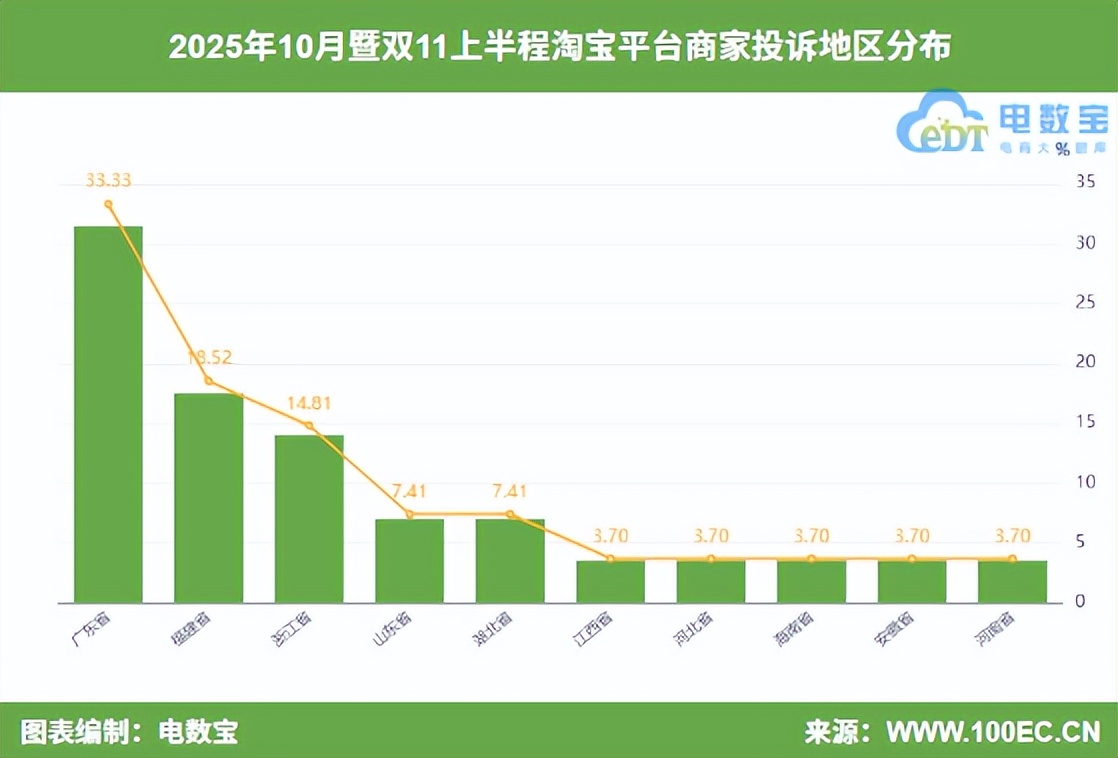 10月暨双11上半程,投诉淘宝平台的商家注册地区TOP5依次为广东省(33.33%)、福建省(18.52%)、浙江省(14.81%)、山东省(7.41%)、湖北省(7.41%)。