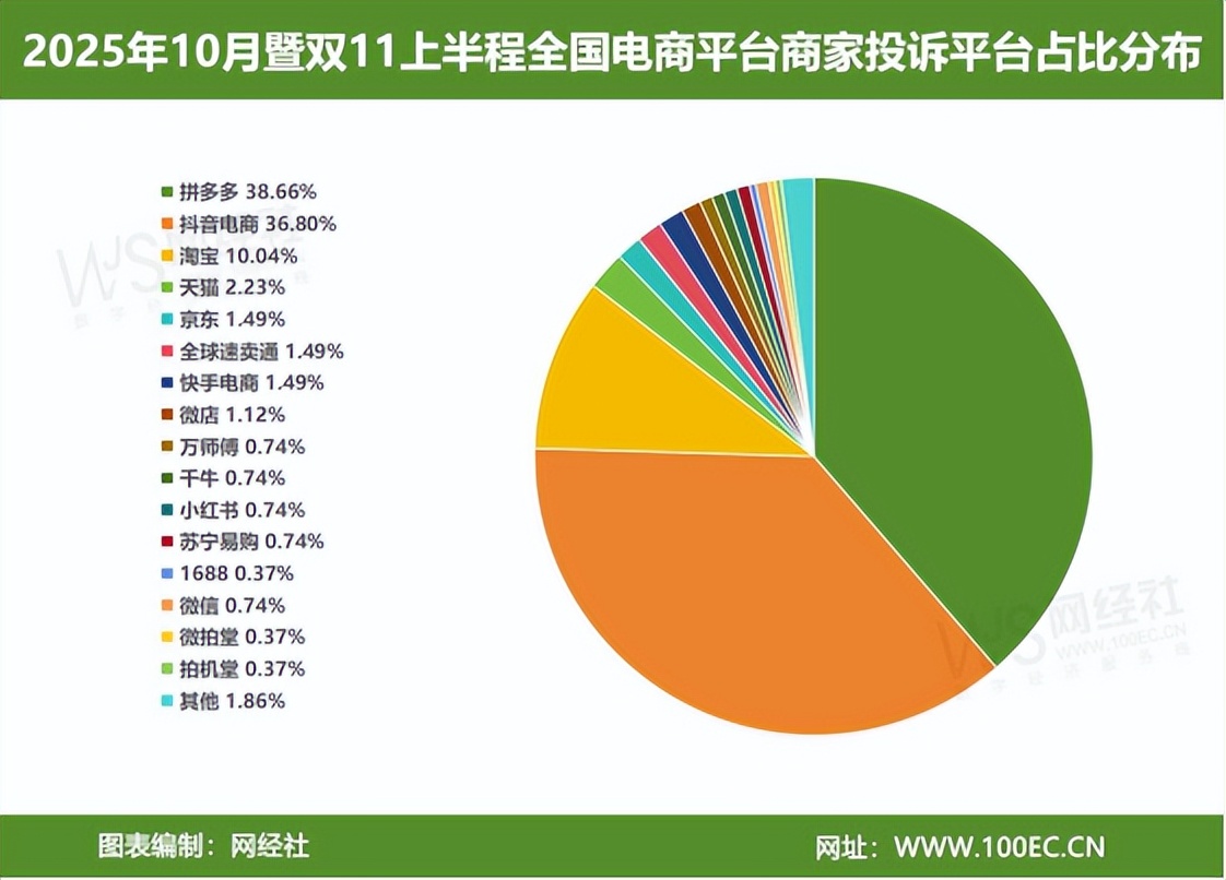 据“电诉宝”显示,10月暨双11上半程电商平台商家投诉平台占比依次为:拼多多(38.66%)、抖音电商(36.80%)、淘宝(10.04%)、天猫(2.23%)、京东(1.49%)、全球速卖通(1.49%)、快手电商(1.49%)、微店(1.12%)、万师傅(0.74%)、千牛(0.74%)、小红书(0.74%)、苏宁易购(0.74%)、1688(0.37%)、微信(0.74%)、微拍堂(0.37%)、拍机堂(0.37%)、其他(1.86%)。