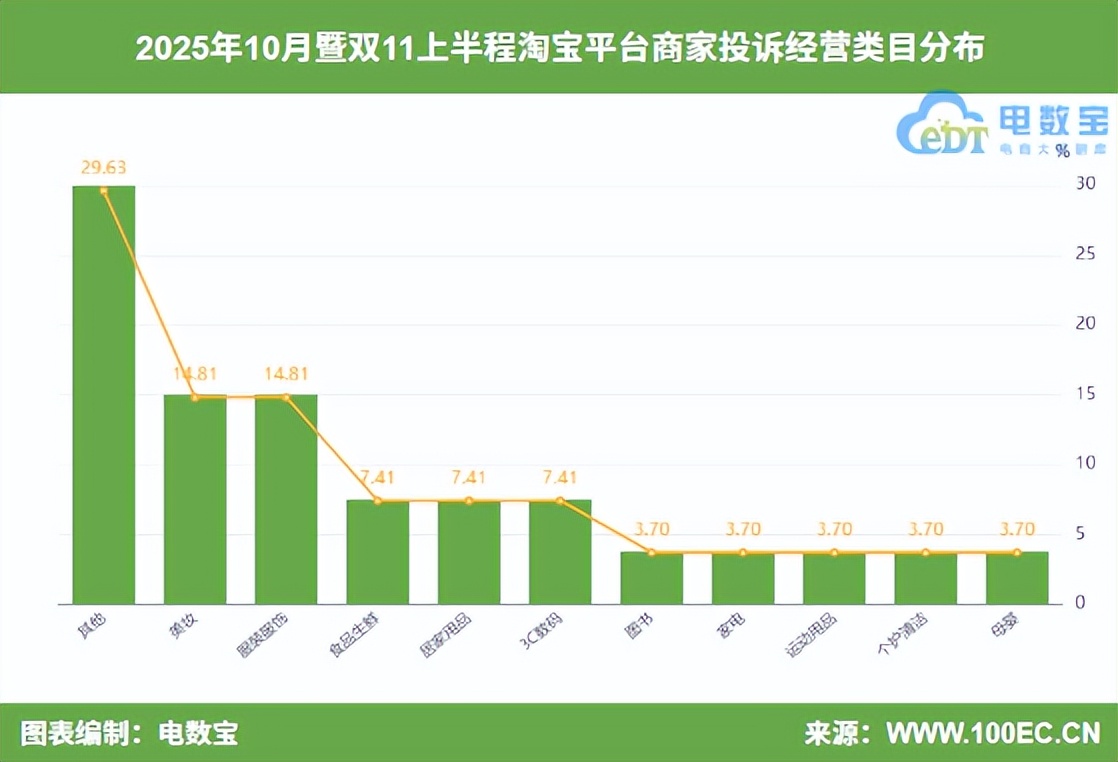 据“电诉宝”显示,10月暨双11上半程淘宝平台涉及的商家投诉问题类型主要集中在:过度维护消费者(37.04%)、任意仅退款(25.93%)、扣押保证金(11.11%)、任意罚款(11.11%)。