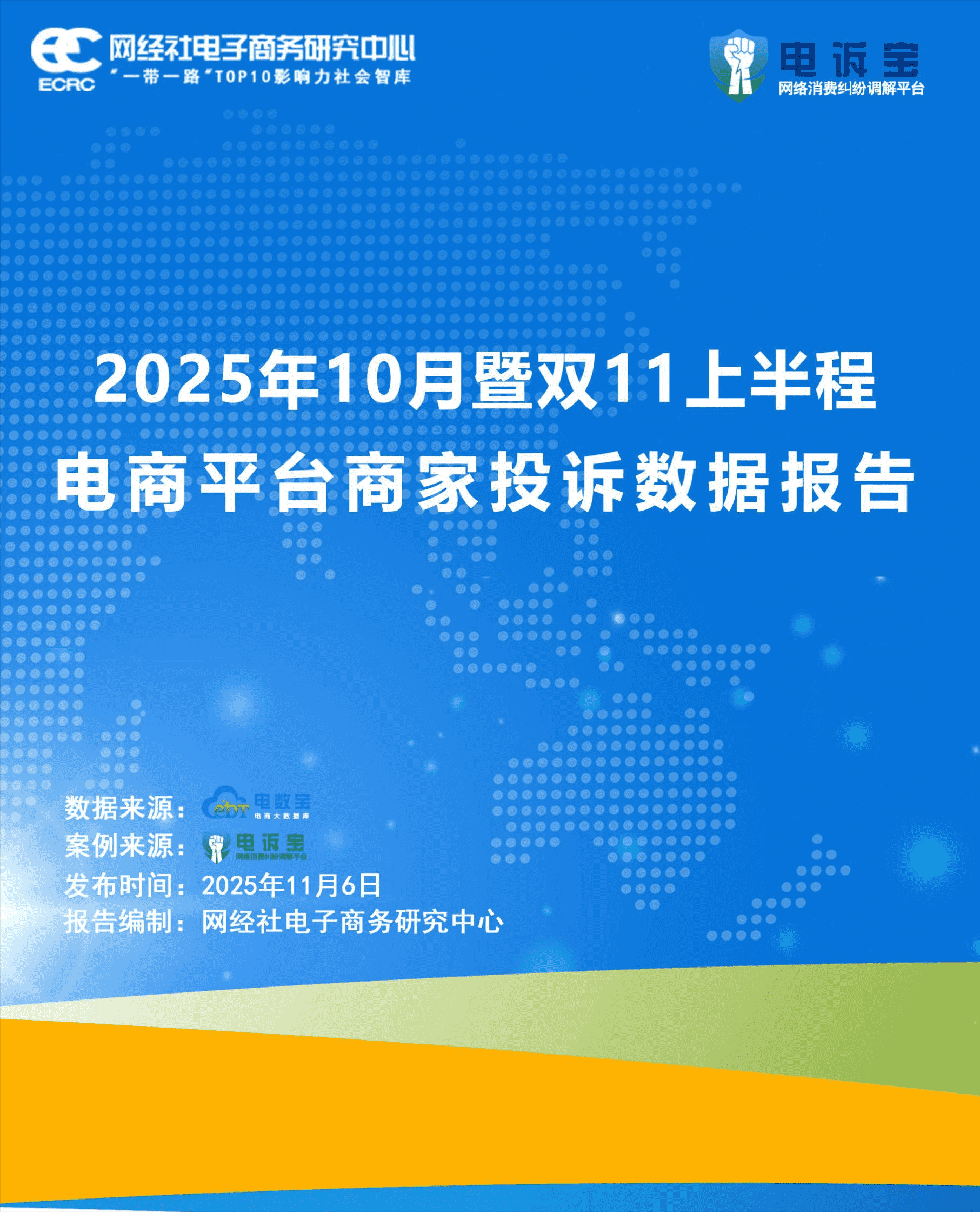 11月6日,依据网络消费纠纷调解平台“电诉宝”商家投诉通道10月受理的全国电商平台大量商家投诉案例,网经社电子商务研究中心例行发布**《2025年10月暨双11上半程电商平台商家投诉数据报告》**。报告涉及了综合电商、直播电商、生活服务电商、电商服务商等领域,并公布了10月暨双11上半程电商平台商家投诉数据及十大典型案例,通过这些投诉案例可窥见当前电商平台商家困境。