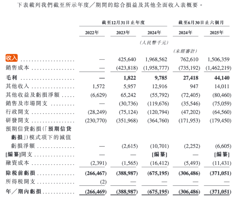 更为关键的是公司的盈利难题。尽管产品已经完成商业化落地,近年来公司收入不断增长,但亏损幅度却仍在扩大。招股书显示,2022年-2024年,公司亏损分别达到2.66亿元、3.89亿元、6.75亿元,今年上半年继续亏损3.71亿元,即报告期内的三年半时间,公司累计亏损约17亿元。公司解释称,这主要源于公司研发及技术创新等还处于早期投资阶段。