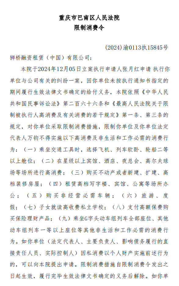 需要注意的是,今年5月,狮桥融资租赁(中国)有限公司因未按时履行生效法律文书确定的给付义务,与法定代表人万钧一起,被重庆市巴南区人民法院采取了限制高消费措施。