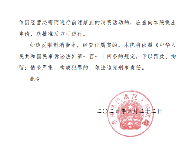 ▲重庆市巴南区人民法院限制消费令