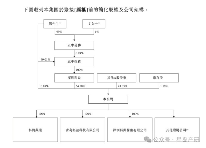 招股书显示,目前科兴制药的实际控制人为邓学勤,共计持有55.38%的股份,其中直接持有0.88%,另通过深圳科益间接持有54.5%,而深圳科益背后则是邓学勤控制的深圳正中集团,一家位于深圳的房地产企业。