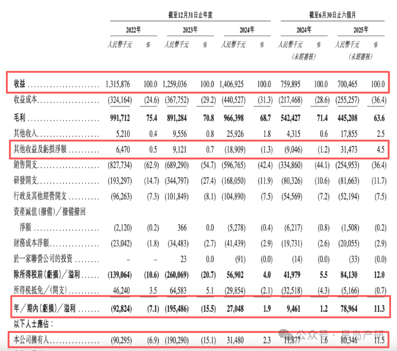 今年6月底前,科兴制药曾完成一笔交易——将一家附属子公司深圳嘉通制药以0.15亿元的价格出售并获得收益;此外,得益于按公平值计入损益的金融资产未变现公平值从2024年末的-0.29亿元变为2025年上半年的0.16亿元,上半年该公司的其他收益及亏损净额也从2024年末的-0.19亿元,突然飙升至0.31亿元。