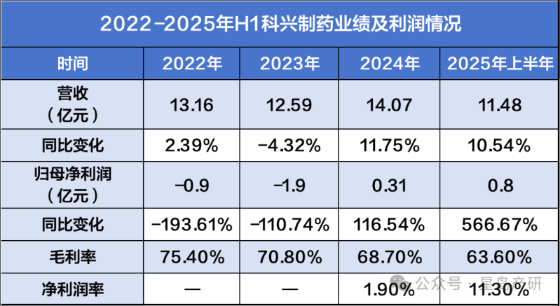 若将时间线拉长,近几年来科兴制药的营收已呈现出明显的增长压力,2024年以前同比涨幅最高仅5%左右,2023年甚至出现负增长,2020—2024年营收分别为12.2亿元、12.85亿元、13.16亿元、12.59亿元、14.07亿元。