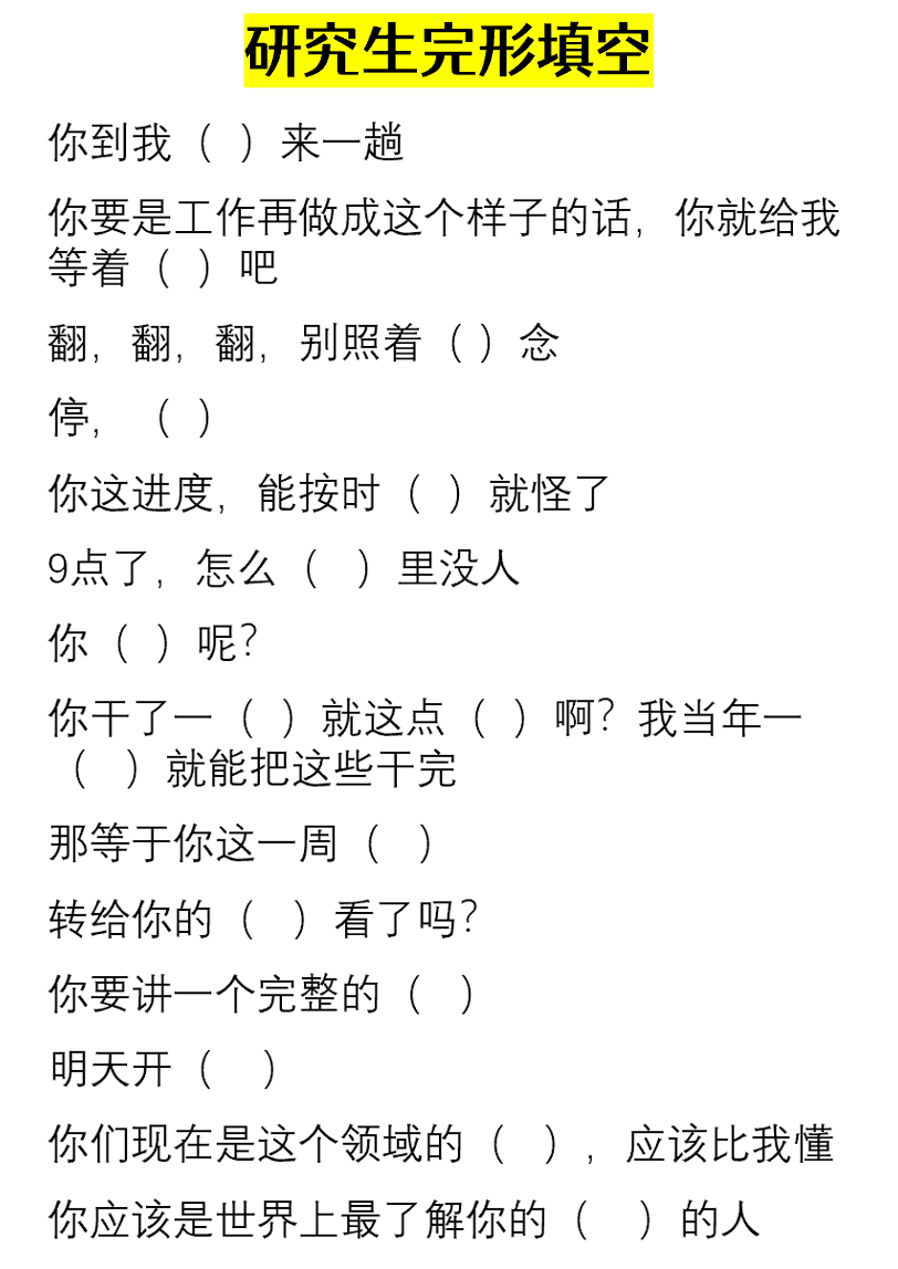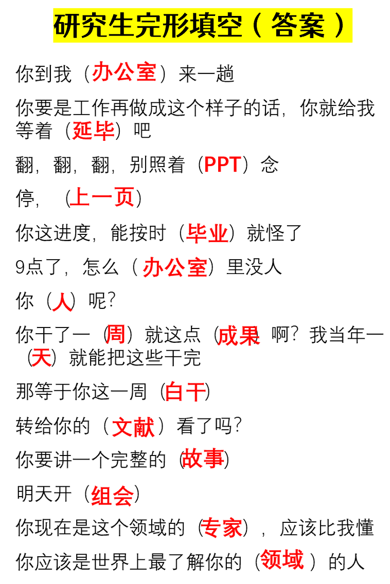 现在网上流传很多版本的研究生完形填空,说是只有硕博能够秒答。我也草拟了一版,感兴趣的朋友请作答:
