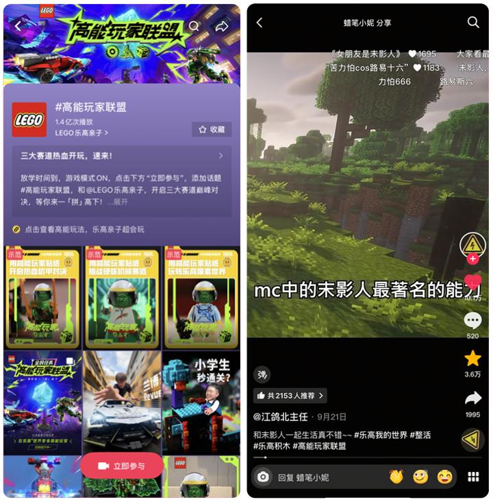 其次,是说对了话。面向泛行业人群,乐高积木打造了“超1万用户参与、话题曝光超1.4亿”的全民任务#高能玩家联盟,结合变装贴纸,拉动UGC广泛参与;面向青少年兴趣圈层,则借游戏达人抽象梗剧情等内容,进一步提升种草效率。