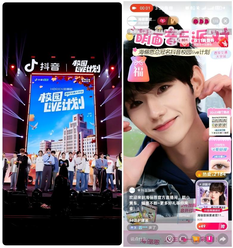 隐形眼镜品牌海俪恩始终以“有温度的陪伴”为核心,捕捉Z世代萌宠情感共鸣——从收养流浪狗“蛋挞”“黑莓”、到推出“萌生宠爱”小狗系列,用真诚的情感连接打动年轻用户。新品发布期,海俪恩总冠名平台SS级活动抖音“校园 LIVE 计划”,在线下打造充满暖意的“萌宠派对”事件营销,让情感共鸣自然转化为口碑与生意增长。