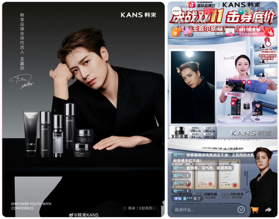 比如,韩束创新打造的“明星同款拍卖”品牌自播间,跳出了自播间卖货的单一属性,用互动感和娱乐性十足的内容,让自播间成为品牌和年轻消费者直接对话的窗口。而和抖音域内多位头部达人的达播共创,则进一步加深了目标人群的品牌认知和销售转化。