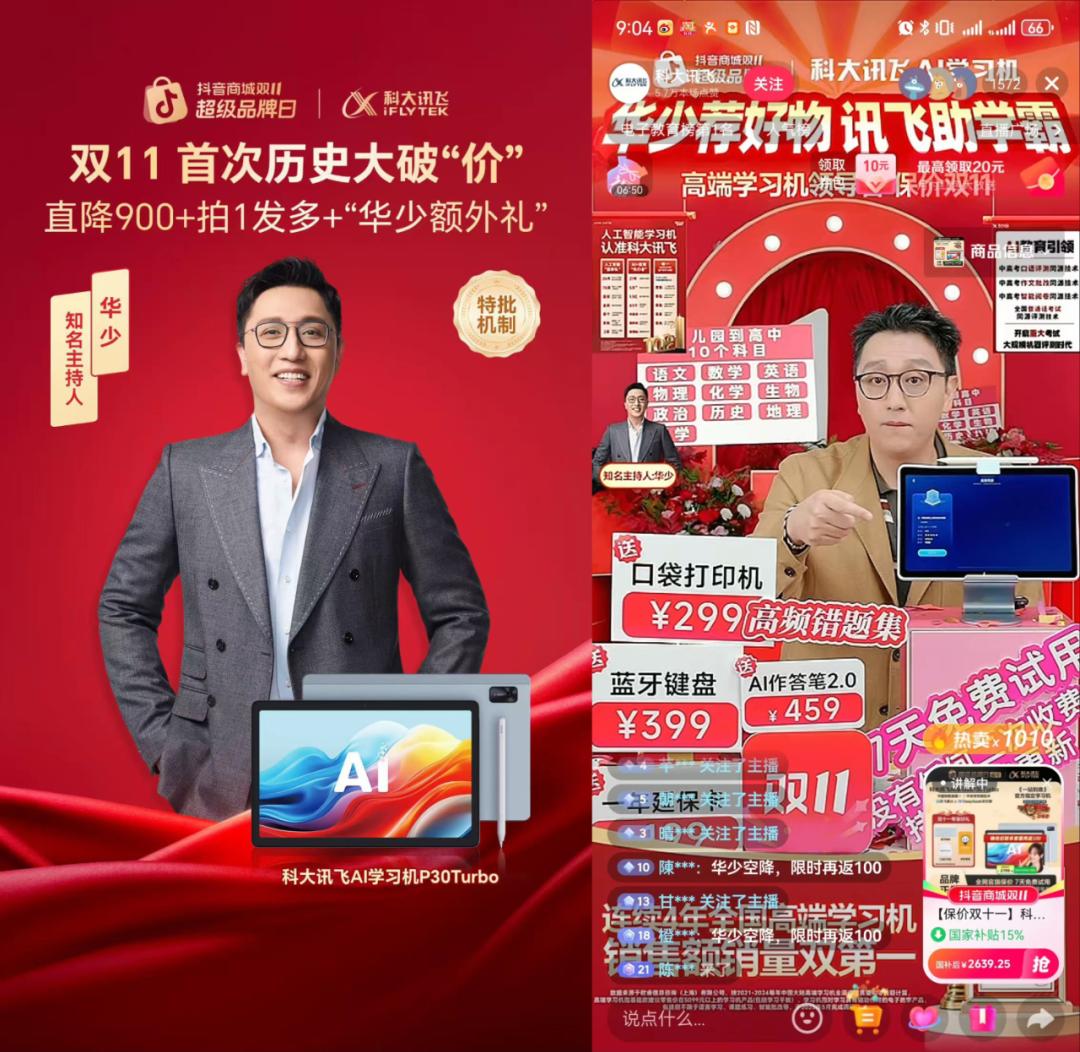 今年双11,为了传递AI学习机“孩子省时爸妈省心”的产品心智,科大讯飞就邀请主持人华少空降品牌直播间,一面是专业主持人的理性讲解,驱动家长深度理解科大讯飞的技术实力。另一面配合定制化的华少砍价剧情短视频,强化价格优势。