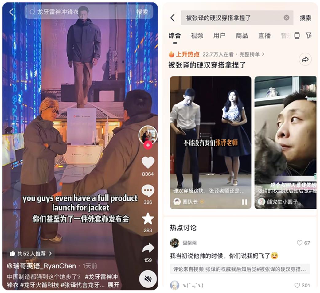 第二步,用“明星代言人+行业大咖+KOL”的矩阵式传播,形成扩散效应,代言人张译的硬汉式穿搭在抖音站内成为讨论热点,发布会现场来自专家和不同圈层达人的解读,让更多消费者感受到新品背后的中国制造硬核实力。
