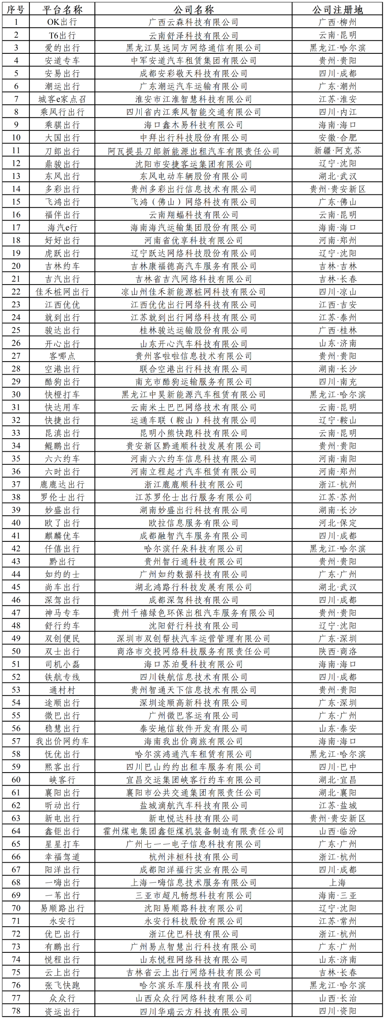 另外,交通运输部还披露了180天以上未传输数据的网约车平台公司。包括OK出行、T6出行、爱的出行、安道专车、安易出行、潮运出行、城客e家点召、乘风行出行、乘骐出行、大国出行、刀郎出行、鼎骏出行、东风出行、多彩出行、飞鸿出行、福伴出行、海汽e行、好好出行、虎跃出行、吉林约车、吉汽出行、佳禾桩网出行、江西优优、就到出行、骏达出行、开心出行、客哪点、空港出行、酷狗出行、快橙打车、快达用车、快捷出行、昆滇出行、鲲鹏出行、六六约车、六时出行、鹿鹿达出行、罗伦士出行、妙盛出行、欧了出行、麒麟优车、仟停出行、黔出行、如约的士、尚车出行、深驾出行、神马专车、舒行约车、双创便民、双士出行、司机小磊、铁航专线、通村村、途顺出行、微巴出行、稳慧出行、我出价网约车、忧优出行、熙客出行、峡客行、襄阳出行、昕动出行、新电出行、鑫钜出行、星星打车、幸福驾道、阳洋出行、一嗨出行、一苇出行、易顺路出行、永安行、优巴出行、有鹏出行、悦程出行、云上出行、张飞快跑、众众行、资运出行。
