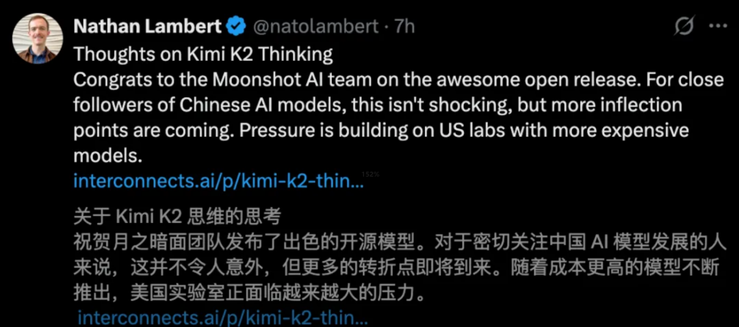 美国AI研究者Nathan Lambert表示:这是开源模型距闭源前沿最近的一次。