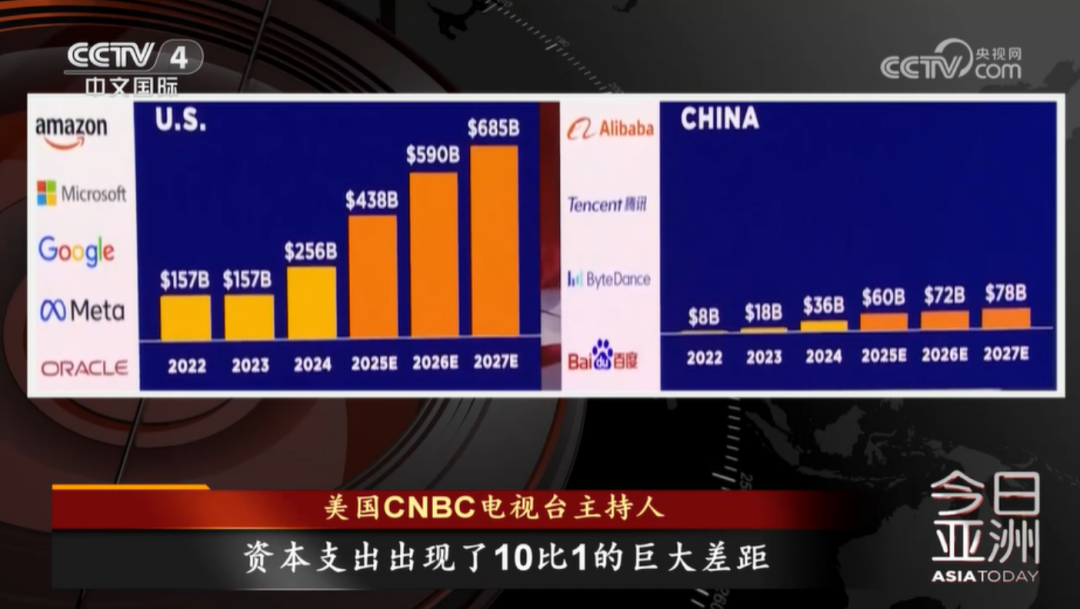 高盛发布的图表显示,中美在AI上的投入,居然呈现出日益扩大的差距。美国科技巨头们预计到2027年将向数据中心投入近7000亿美元,而中国头部企业——阿里巴巴、腾讯、字节跳动和百度,预计总支出将不足800亿美元。