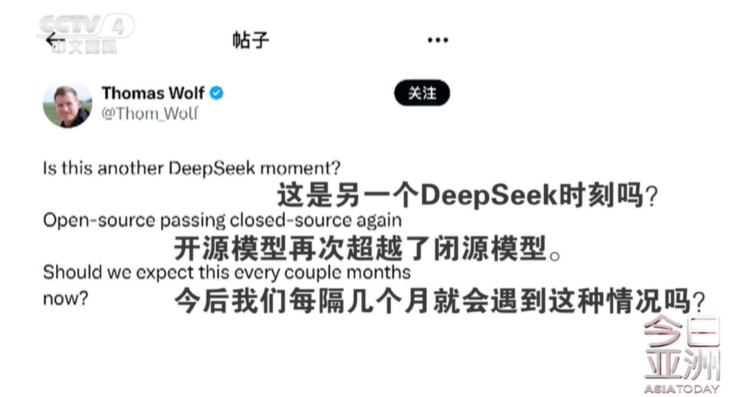 “这是另一个DeepSeek时刻吗?” Hugging Face公司联合创始人托马斯·沃尔夫在个人社交账号上问道。他表示,“开源模型再次超越了闭源模型。今后我们每隔几个月就会遇到这种情况吗?”